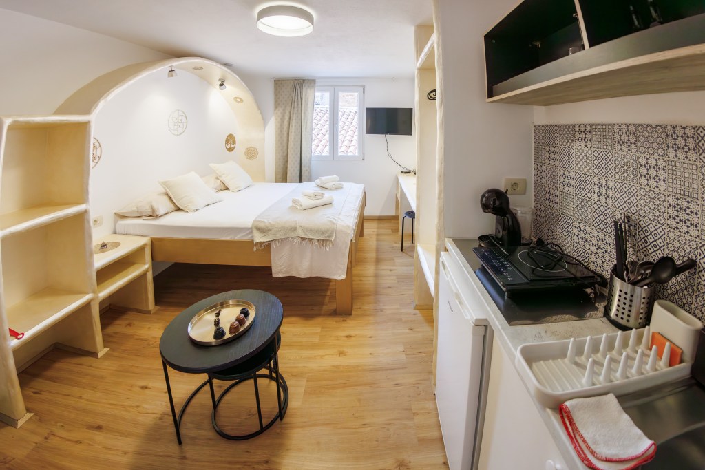 For those looking for a little more room to unwind, our Deluxe Double Room offers a stylish upgrade on comfort. Featuring a queen-sized bed, a private bathroom, and a well-equipped kitchenette with stovetop and fridge, it’s perfect for couples, friends, or business travelers who value both space and convenience. The room is fitted with air-conditioning, parquet floors, and soundproofing, creating a calm and refreshing environment where you can truly relax.